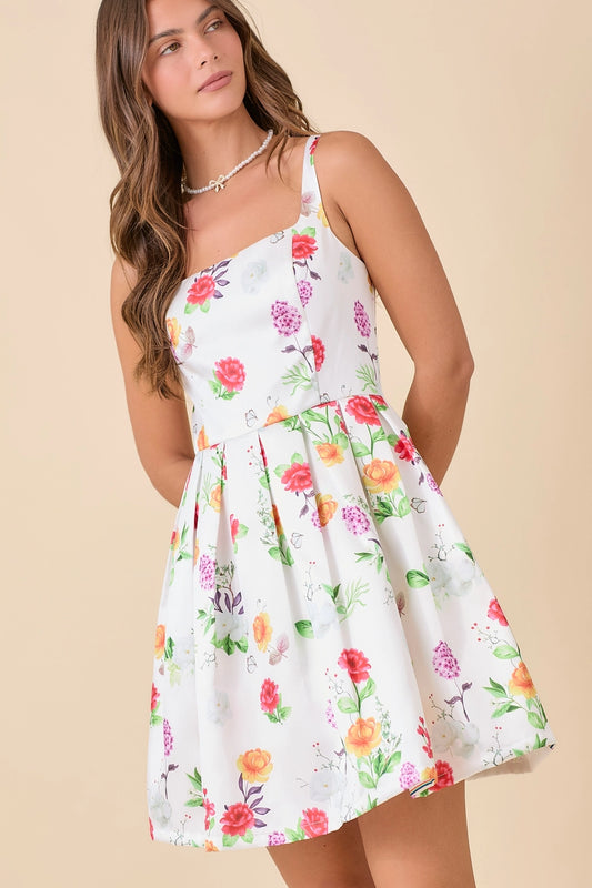 White Floral Square Neck Puff Sleeve Mini Dress