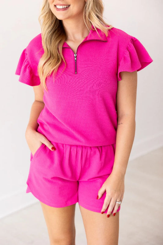 Hot Pink Emma Flutter Sleeve Quarter Zip Set