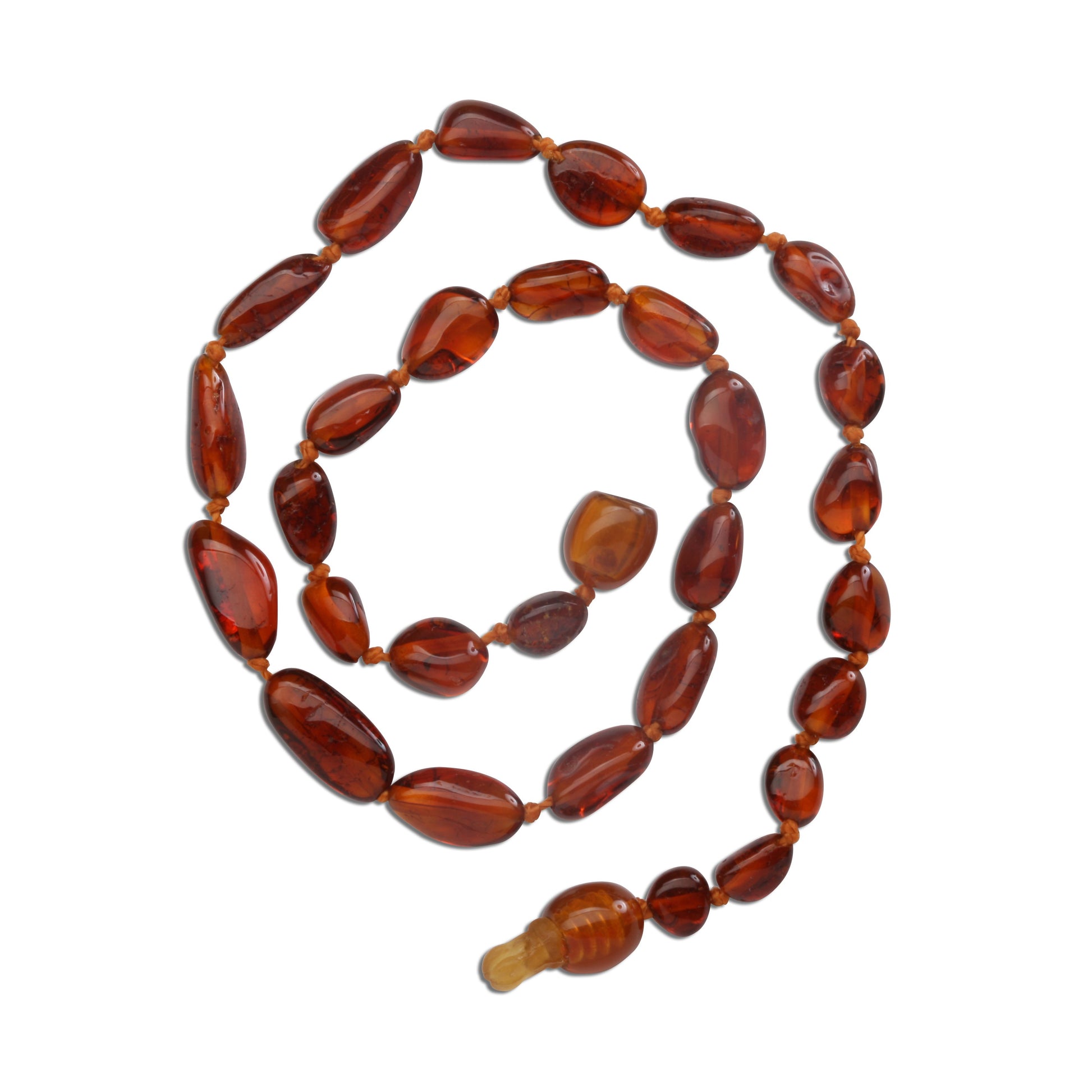 Genuine amber teething necklace with polished beads (light cherry). Comfort your sweet baby with these healing amber beads which can reduce drooling and pain when teething. These amber beads come from Lithuania and are certified 100% natural amber with testing verification from third-party laboratory.