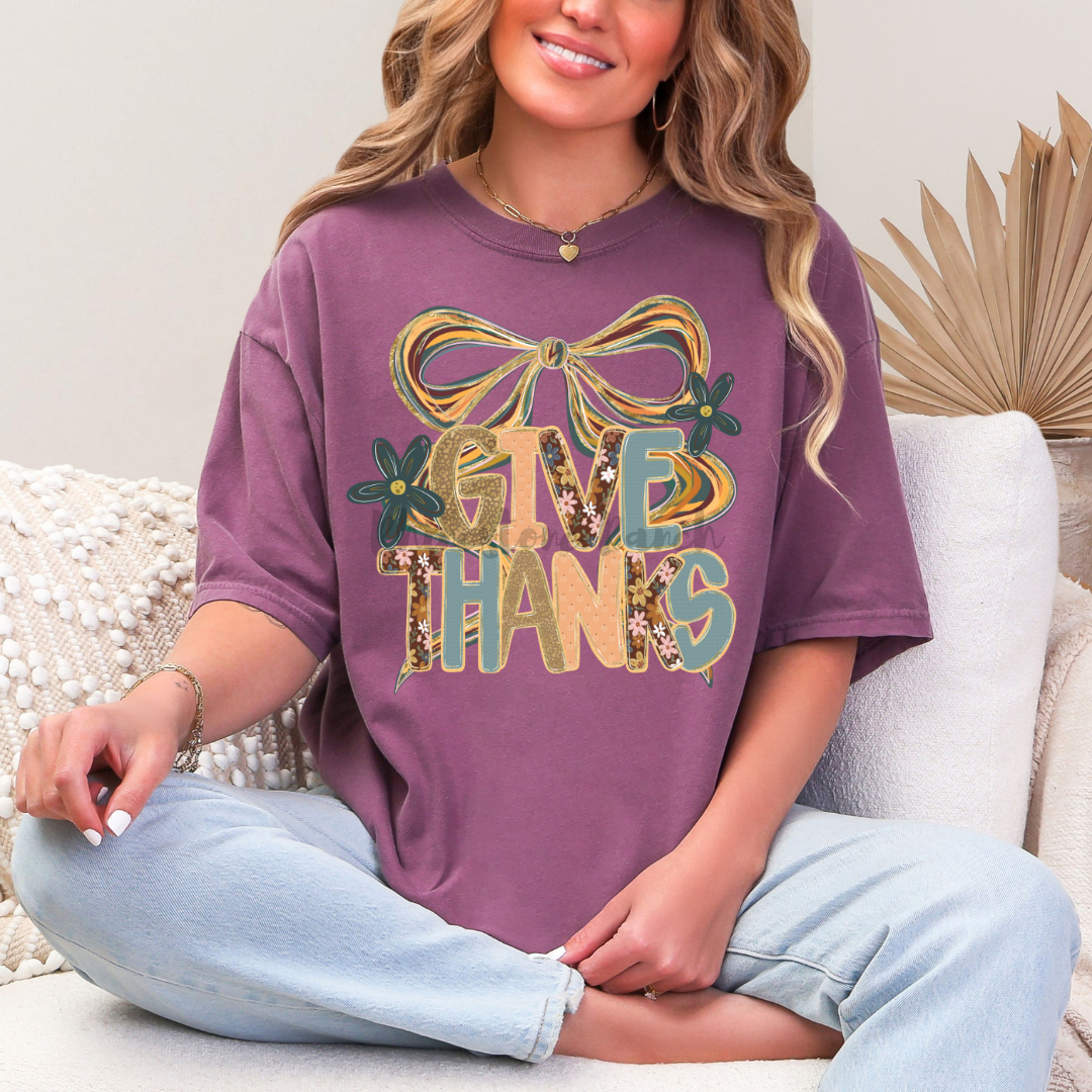 Celebrate gratitude in style with the Berry Give Thanks Bow Tee, printed on ultra-soft Comfort Colors fabric for unbeatable comfort. The vibrant design highlights the spirit of thankfulness, making it perfect for festive gatherings or everyday wear. Experience cozy, lasting softness combined with meaningful fall-inspired flair.