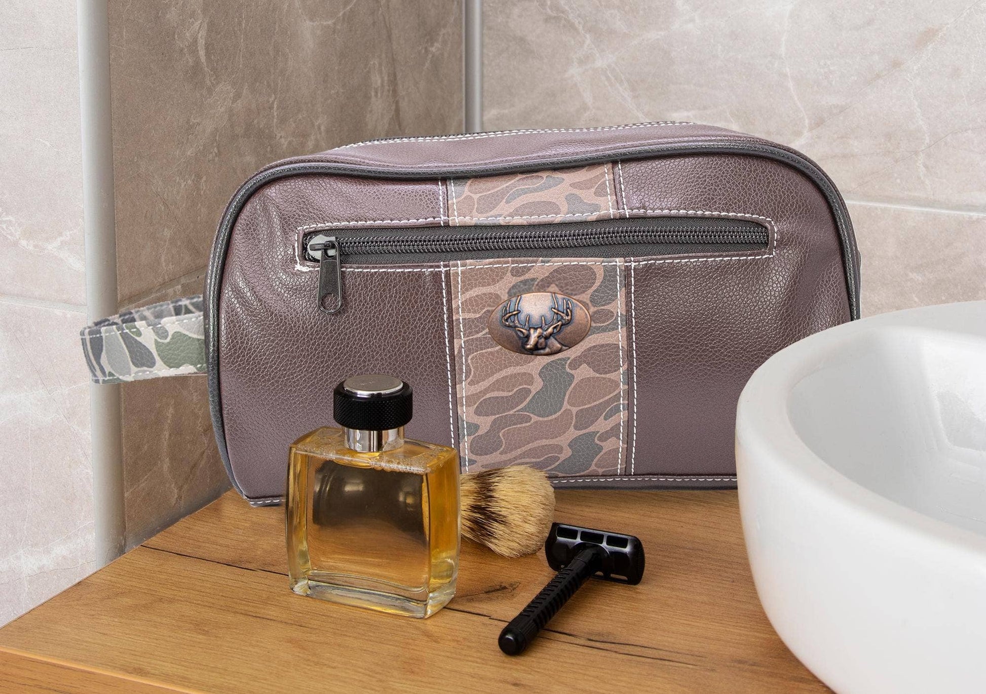 Show your passion with an original Zep-Pro Old School Camo toiletry bag featuring a Buck design. The deer logo and camo print on this dopp kit taps into our intrinsic connection to nature and wildlife. It is a stylish and unique way to show enthusiasm while keeping toiletries secure and organized. This Zep-Pro toiletry bag is constructed of soft and sturdy pebble grain PU. An accented antique copper Buck concho proudly displayed on the front.