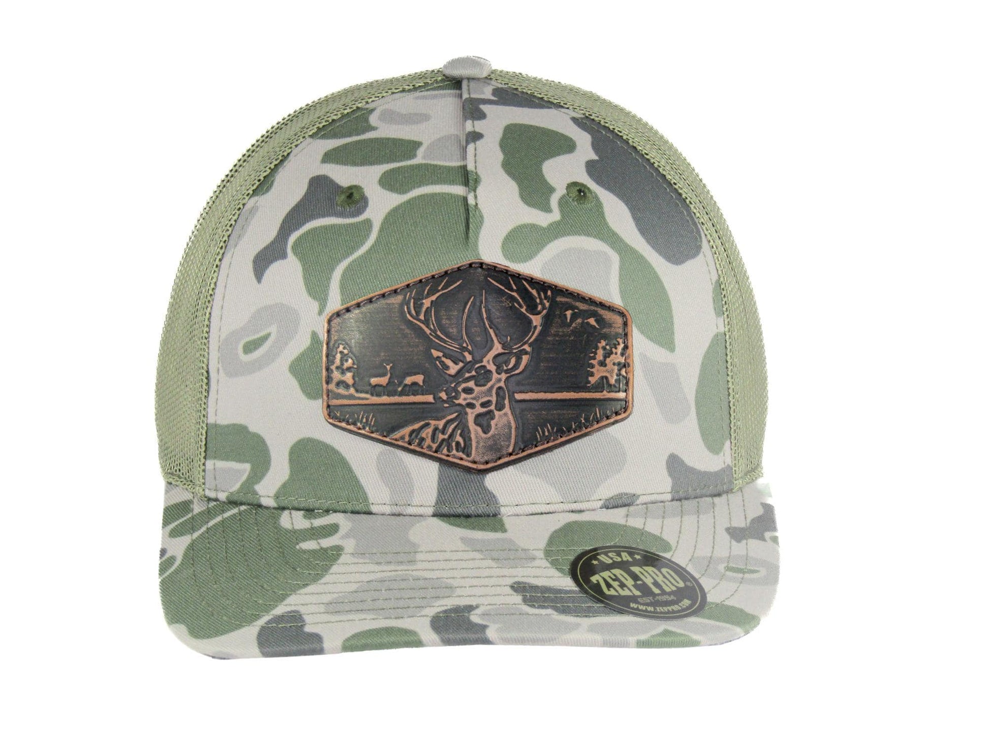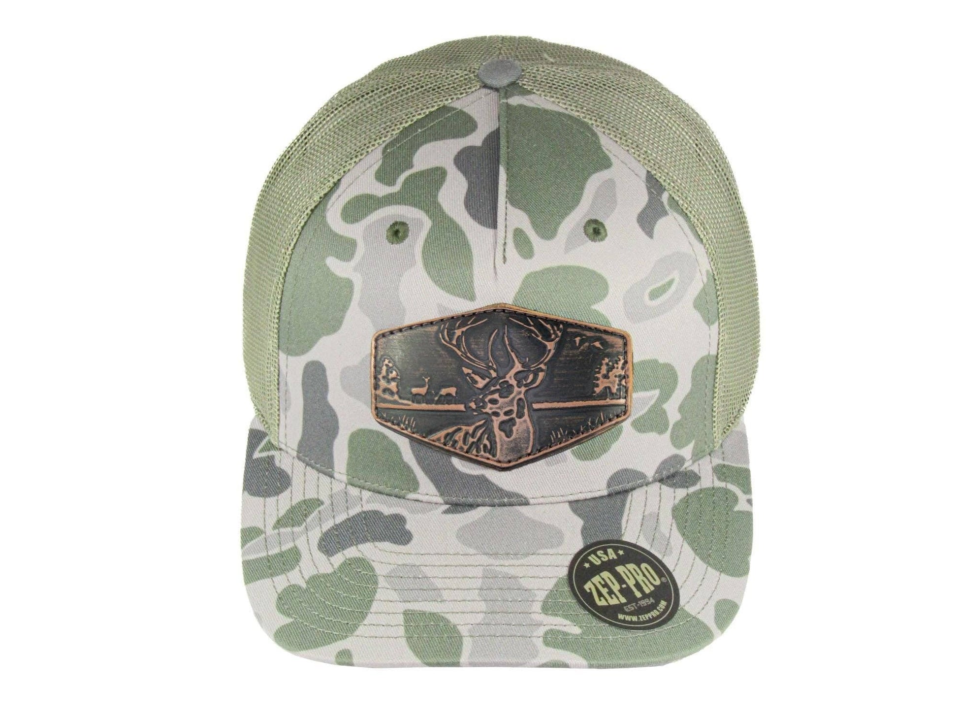 buckbucShow your passion with an original Zep-Pro trucker Buck hat. The leather patch is hand burnished and sewn on a classic Old School Camo Richardson 5-Panel trucker cap. Available in 2 colors. The deer imagery on these hats tap into our intrinsic connection to nature and wildlife. It is a stylish and unique way to show enthusiasm. This Zep-Pro hat is constructed of cotton and poly mix fabric, accented by a 100% full grain leather Buck patch, proudly displayed on the front.