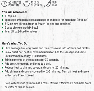 NEW FLAVOR. Our soupy-spin on the classic New Orleans dish: Jambalaya. Using traditional creole seasonings, along with the additions of shrimp and smoked sausage, this soup is sure to thrill even the most sophisticated of southern palates. So grab your rocking chair and we'll meet you on the front porch to devour a bowl or two!