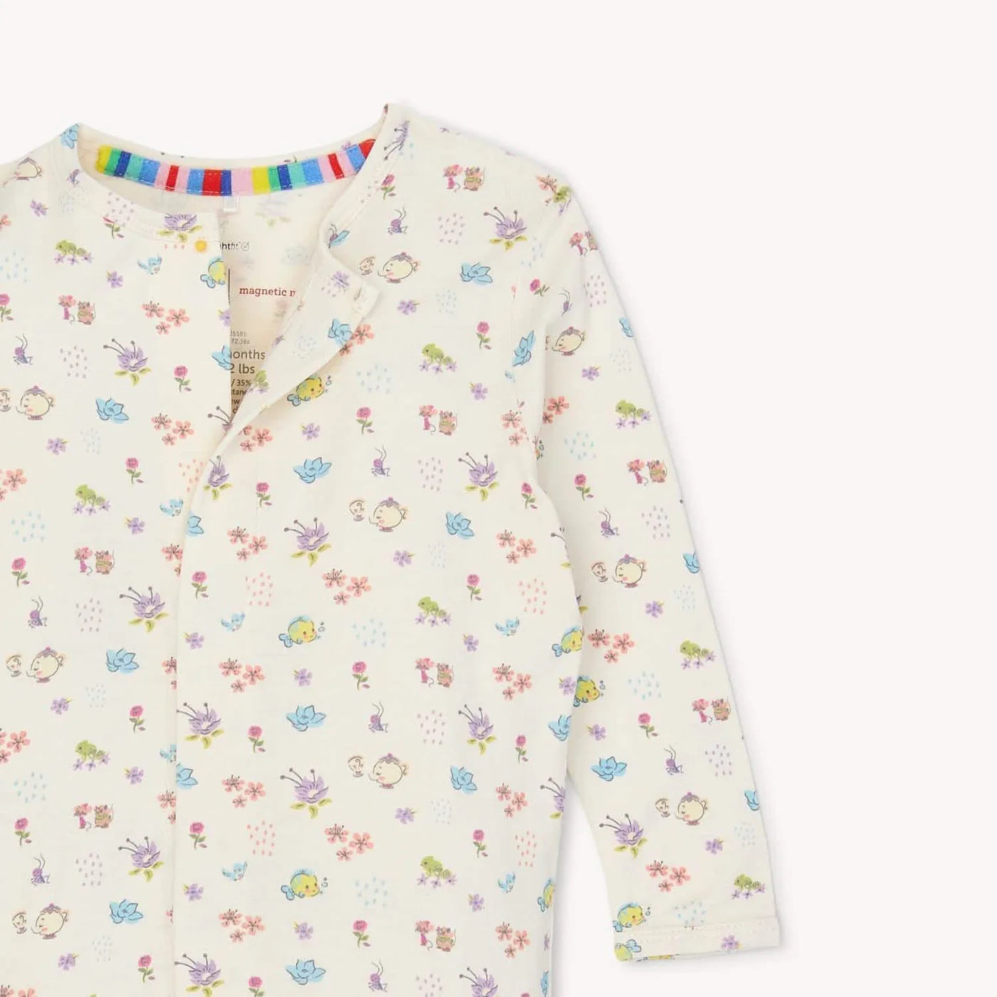 - Magnetic closures: magnets line the seam from the neck to upper thigh for sizes up to 0-3m & from neck to crotch for sizes 3-6m and up.