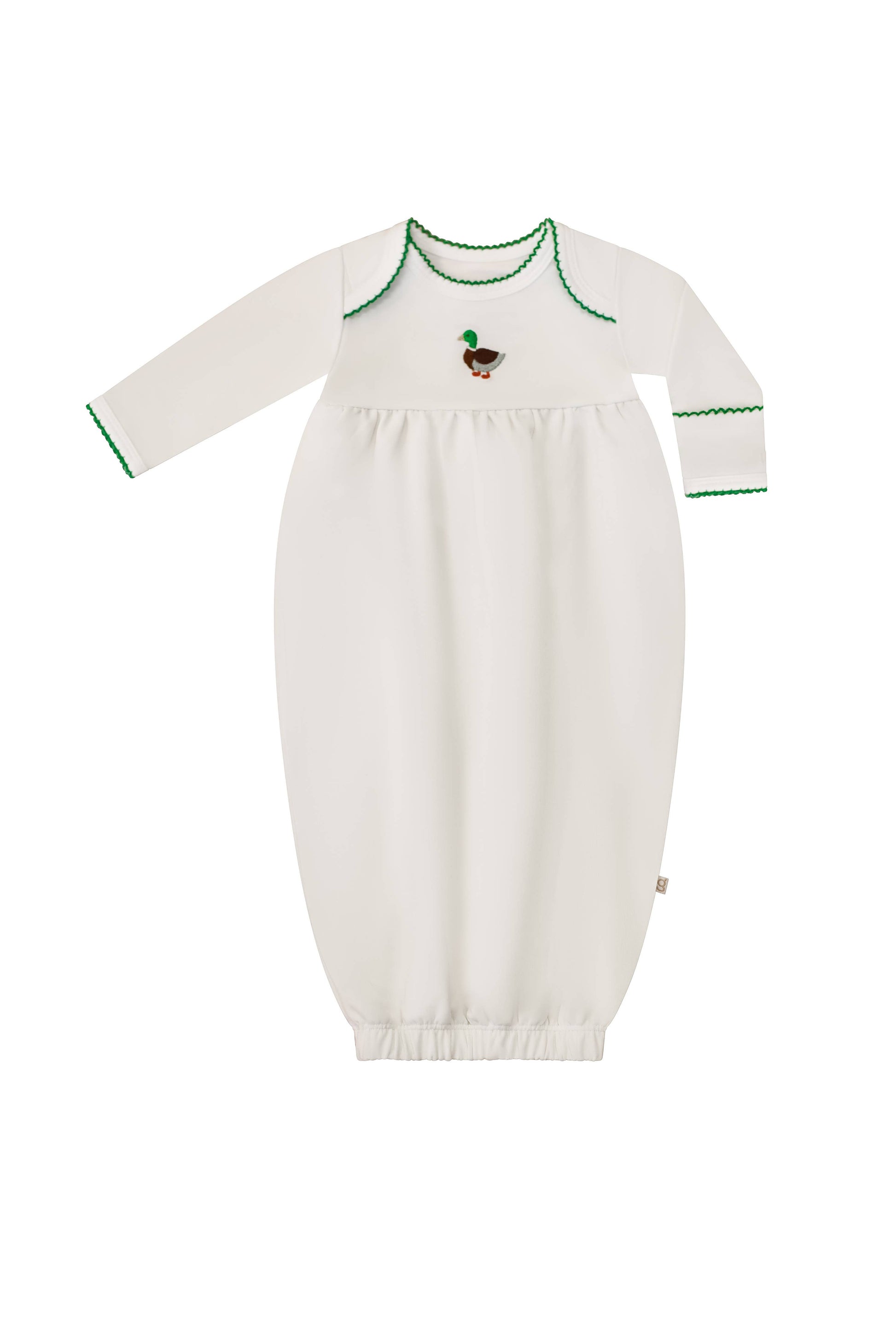 Soft, sweet, and designed for the very beginning 🤍 This timeless infant gown features a delicate embroidered detail at the chest, framed by gentle picot trim along the neckline and sleeves. The flowing silhouette allows for easy movement and quick nighttime changes, while the softly gathered bottom keeps little feet cozy and covered.
