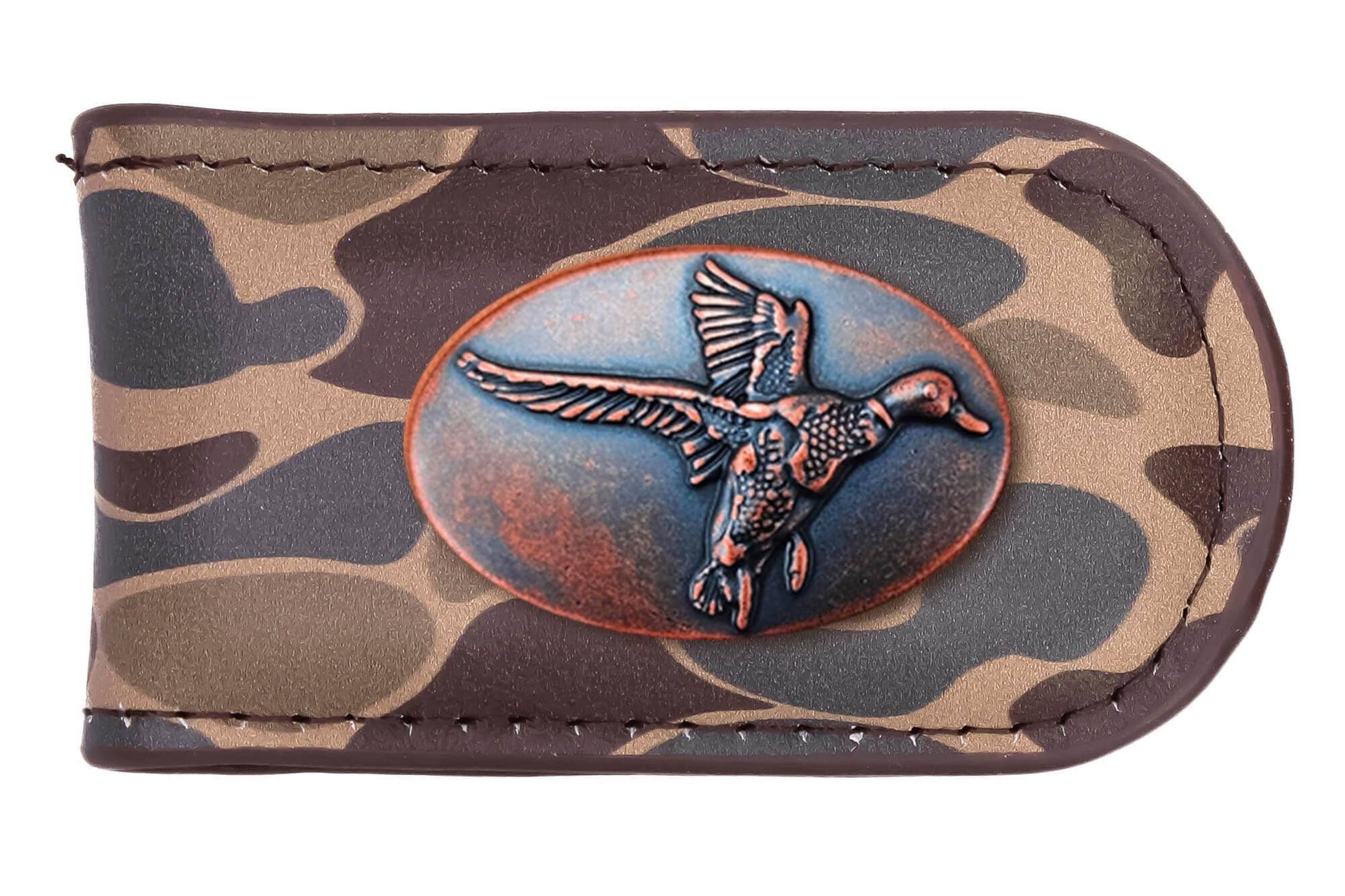 Show your passion with an original Zep-Pro Old School Camo leather money clip featuring a Mallard design. The duck imagery on these wallets taps into our intrinsic connection to nature and wildlife. It is a stylish and unique way to show enthusiasm while keeping important cards and cash organized. This Zep-Pro wallet is constructed of full grain leather with a Old School Camo print and features a Mallard meatal logo, proudly displayed on the front. The metal concho emblem has an antique copper finish which perfectly accents this unique wallet.