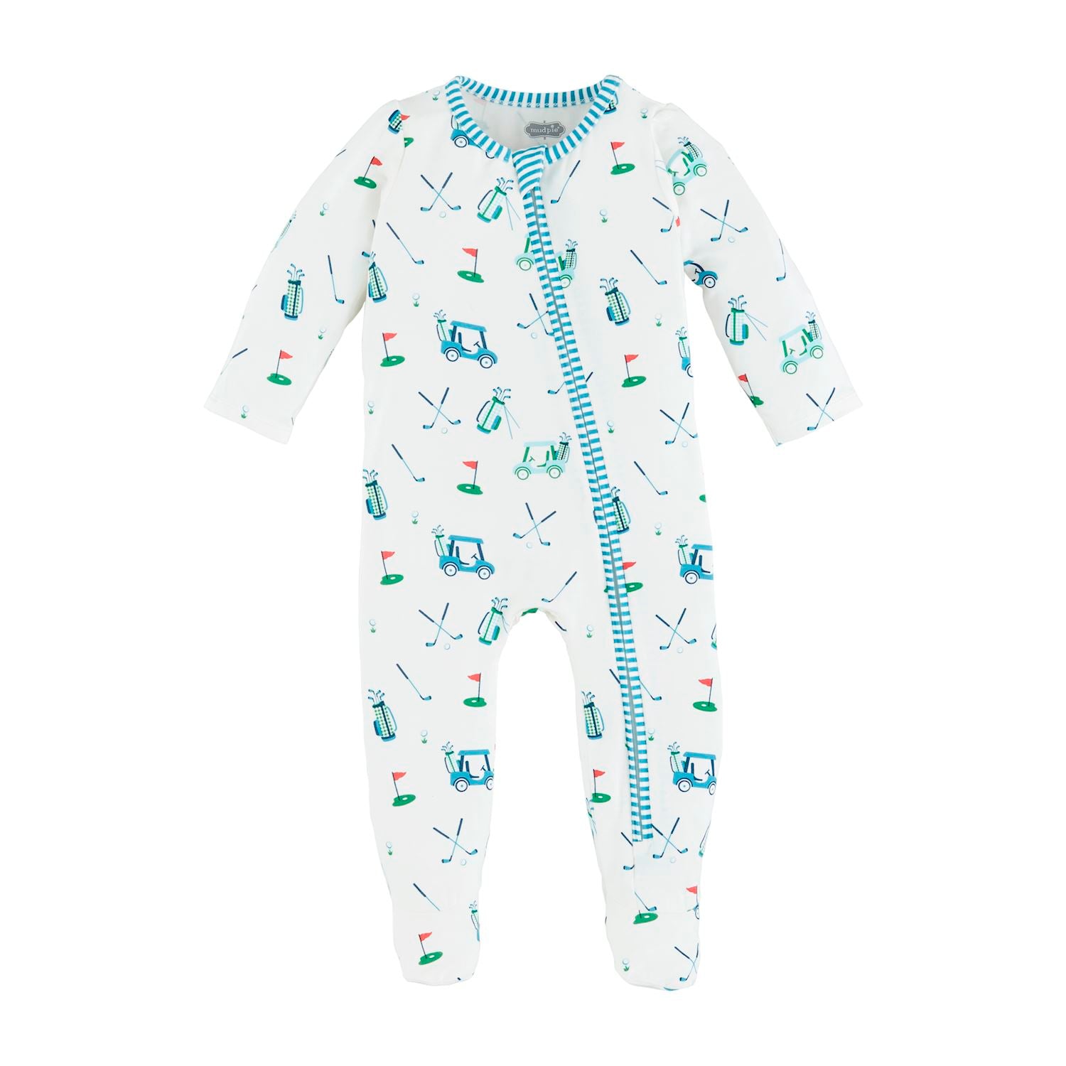 Indulge in luxury and comfort with our Mud Pie Blue Golf Sleeper. Made from soft knit bamboo, this footed sleeper is perfect for a restful night's sleep. Say goodbye to rough fabrics and hello to plush relaxation!