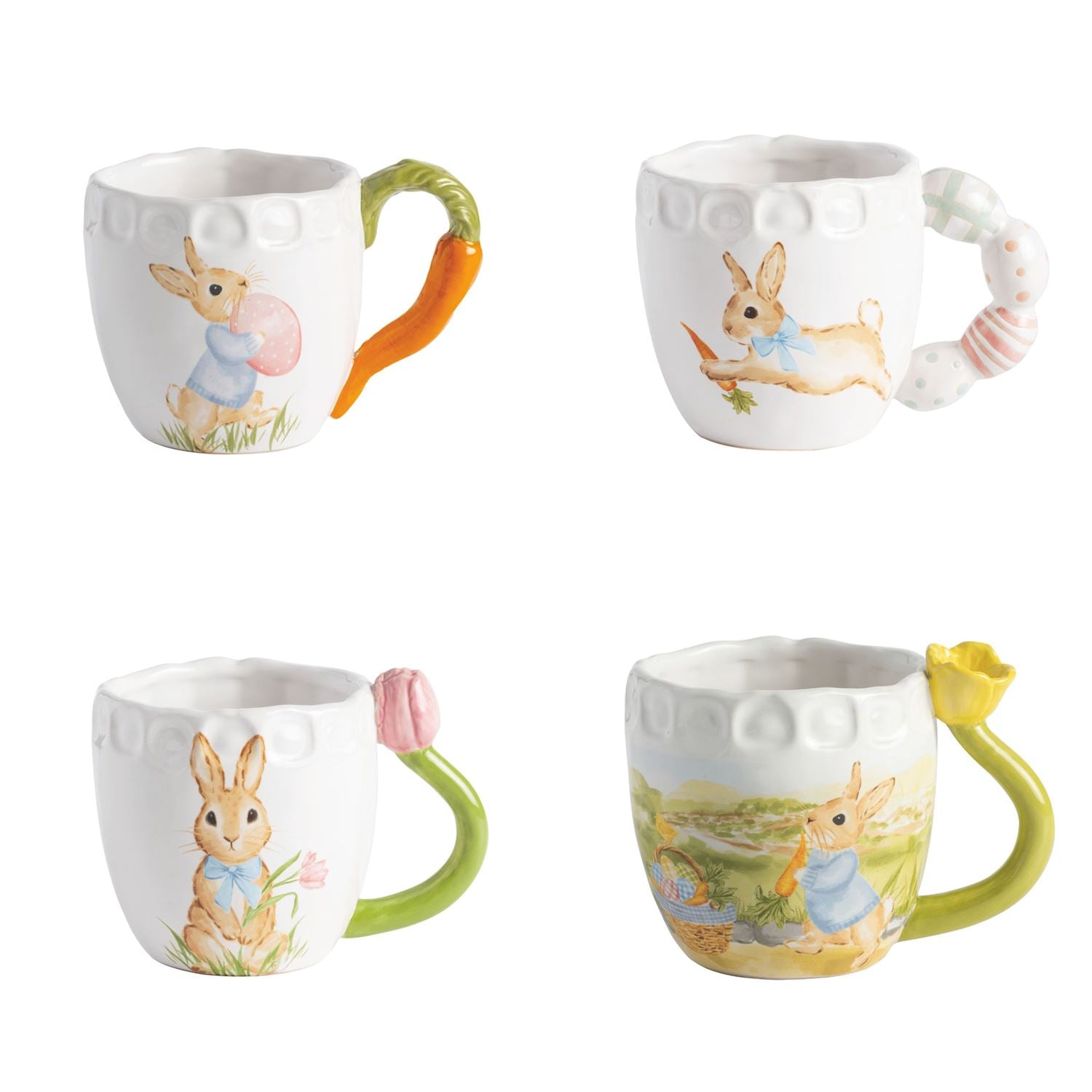Celebrate the season with these charming Mud Pie stoneware mugs, each featuring a textured ceramic body and a whimsical hand-painted figural handle. Choose from four delightful designs—a cheerful carrot, a speckled egg, a soft pink tulip, or a sunny yellow tulip—each adding personality to your morning routine. Perfect for Easter gatherings, spring entertaining, or treating yourself to a touch of seasonal joy. These artisan-crafted pieces make wonderful gifts for anyone who appreciates handmade details and festive flair.