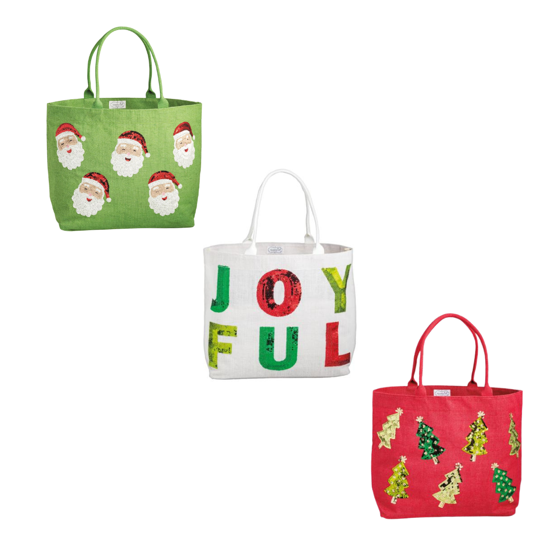 Add festive charm to your holiday outings with these Mud Pie Holiday Classic Sparkle Totes. Crafted from sequin-covered jute, each tote features sturdy cotton webbing handles for easy carrying and a laminated interior that wipes clean effortlessly. Choose from Santa, trees, or Joyful designs to celebrate the season in style while keeping your essentials organized and protected. Perfect for holiday shopping or gifting, these totes bring sparkle and practicality together in one festive package.