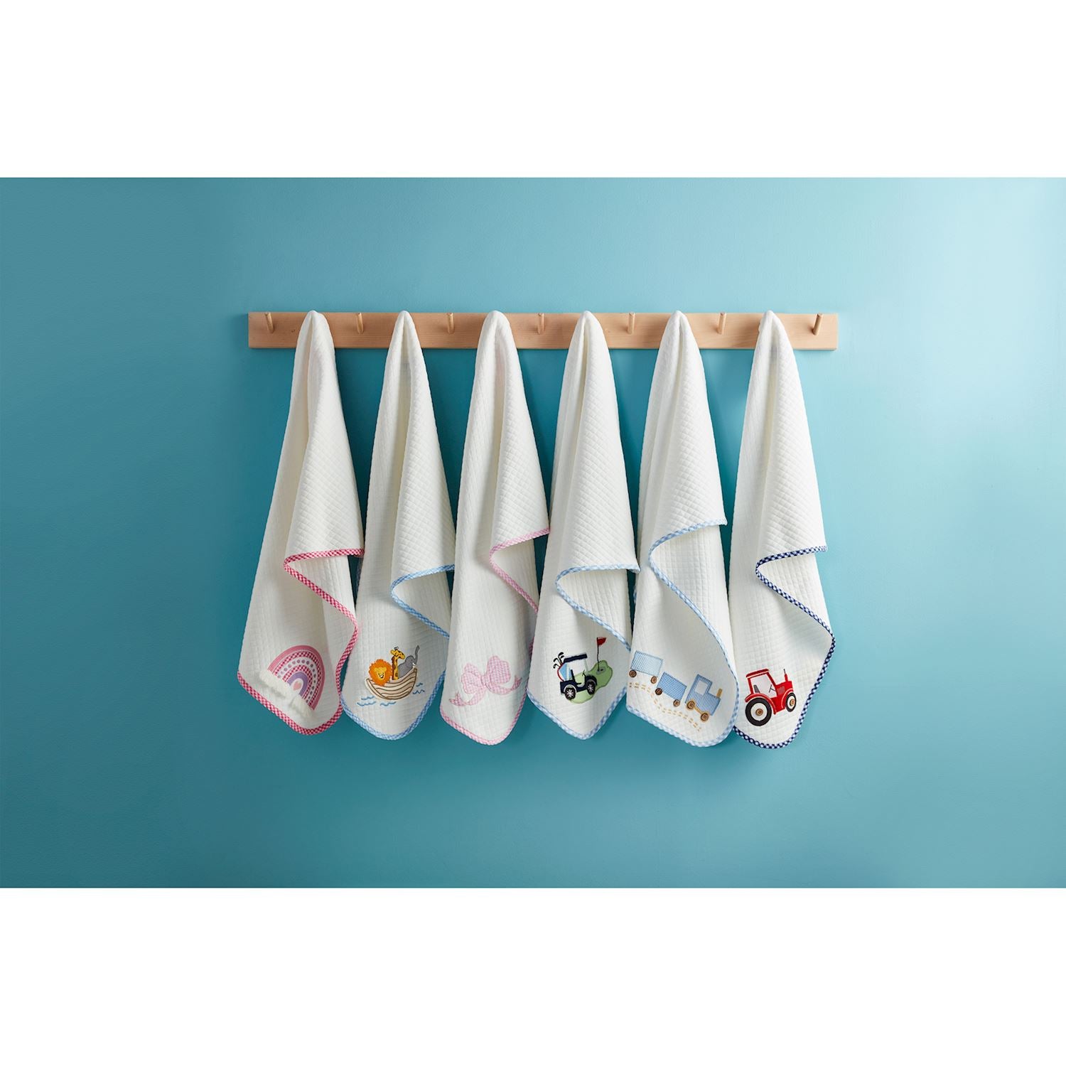 Wrap your little one in cozy comfort with our Mud Pie Noah's Ark Quilted Blanket! Made with soft pointelle fabric, this blanket features a charming corner applique and contrast gingham trim, adding a touch of sweet style to any nursery. Keep your child warm and snug with this blanket, perfect for snuggles and stroller rides!