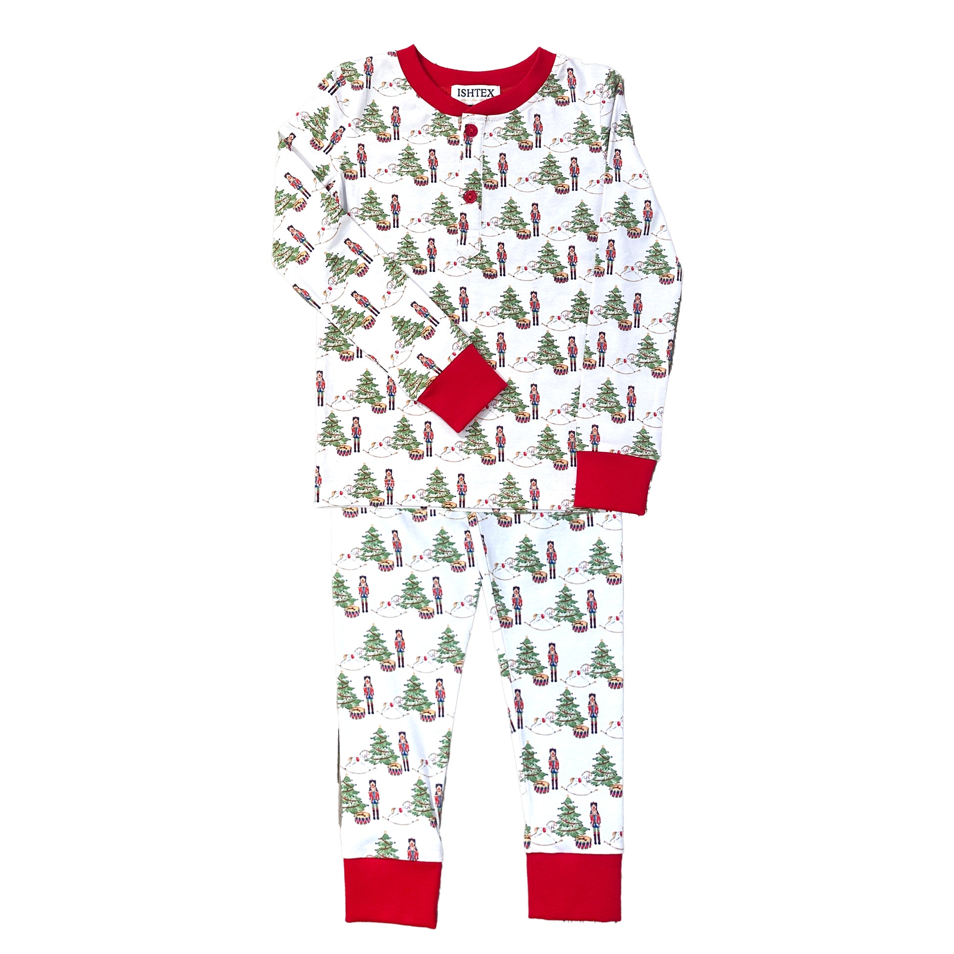 This adorable toddler PJ set features a whimsical nutcracker and Christmas tree print that will delight your little one. Made from soft, comfortable fabric, it's perfect for snuggly holiday seasons. Dress up your child for bedtime and make sweet holiday memories in this festive set.